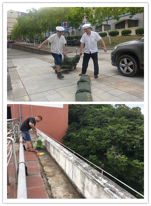 餐饮部增加食品、食材及饮用水等物资储备(北区餐厅延长供餐至7月29日,储备4天量素菜450斤、10天量冻品荤菜4000斤、8天量主食600斤、7吨水;中区餐厅4天量素菜1000斤、10天量冻品荤菜4600斤、7天量主食3500斤、8吨水;北区餐厅发电机存油60升,中区餐厅发电机存油40L;北区和中区餐厅均储备燃气50公斤);检查并疏通天台排水口,清理天台垃圾,做好防汛工作;服务区域立好防滑提示牌,落实恶劣天气及强烈地质灾害应急保障措施,确保食堂供餐安全、稳定;歇业餐厅安排值班人员24小时值守,加强防洪防汛安全巡查。
