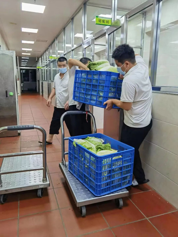为保障台风期间校内各餐厅正常供餐,中心三校区提前储备蔬菜、生鲜食材、冻品、米面粮油等各类食材,确保全校师生在台风期间的正常饮食需求。