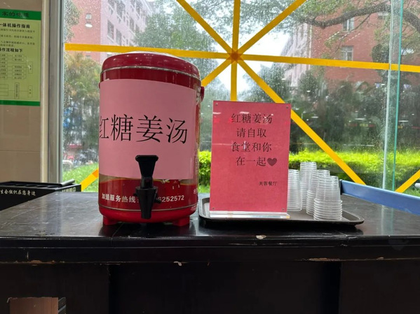 7月28日上午,“杜苏芮”登陆,饮食服务中心各食堂供餐如常,并准备了热乎乎的红糖姜汤,让师生特别暖心。