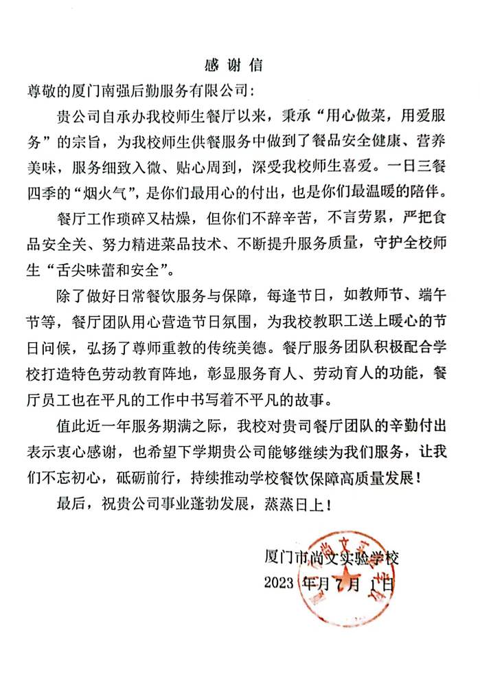 近日,厦门南强后勤服务有限公司收到甲方2封感谢信,对公司提供的优质餐饮服务表示感谢和肯定。