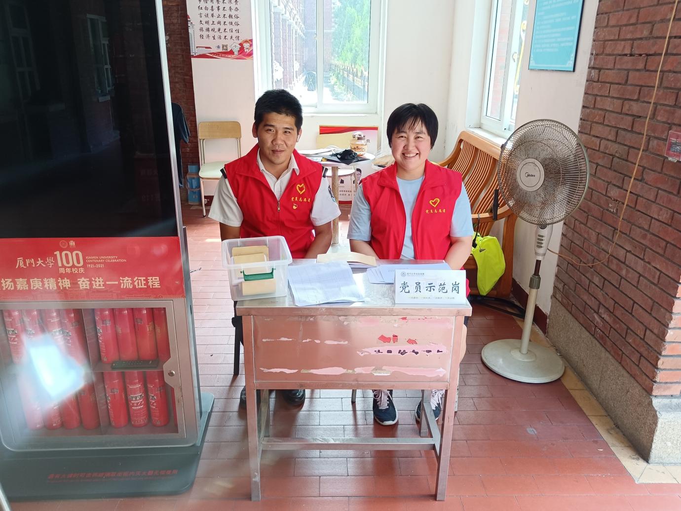 把开展主题教育与退宿服务工作相结合,在毕业退宿服务点设立党员示范岗,充分发挥党员的先进示范作用,党员志愿者亮身份,协助办理退宿手续。