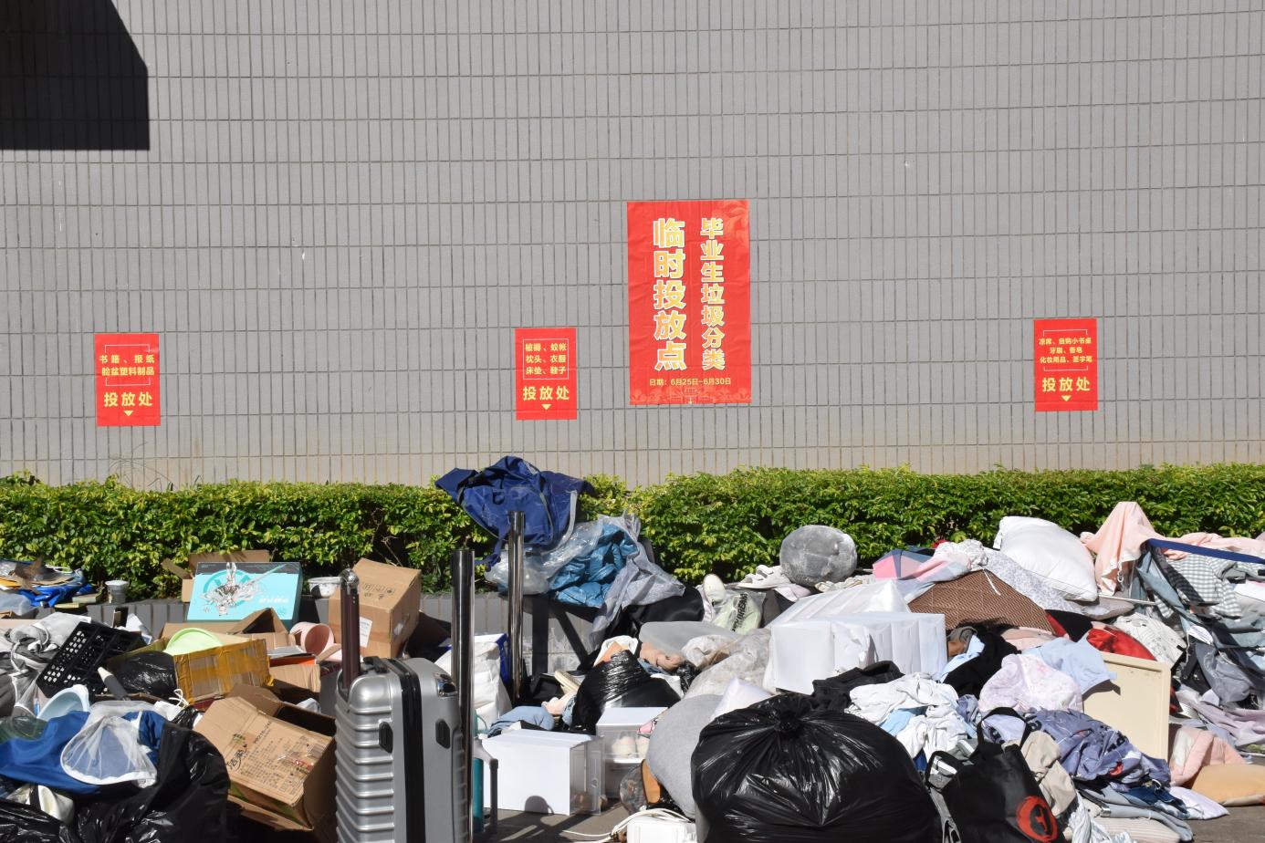 在原有垃圾分类点位的基础上,在毕业生宿舍园区临时划定区域,并设置指示牌指引,使毕业生能够就近投放垃圾。