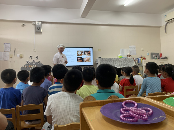 课上,南光餐厅烘焙师傅郑建鹏通过图片、视频,带领孩子们了解烘焙的起源,一般烘焙的制作过程以及烘焙的种类和工具。发酵面包是怎么发明的?面包有哪些品种?面包有哪些营养价值?孩子们心中一个又一个的小问号也变成了感叹号。郑建鹏师傅还与幼儿园小朋友进行互动,让他们看一看、摸一摸烘焙的工具是什么样的,就在这样轻松、活泼、你问我答的氛围中,愉快结束了烘焙课。