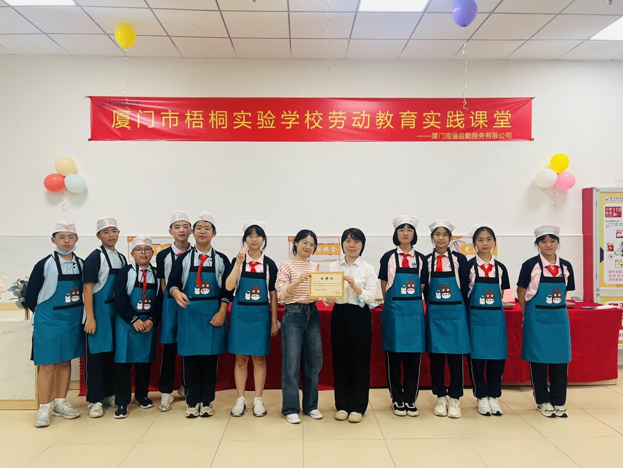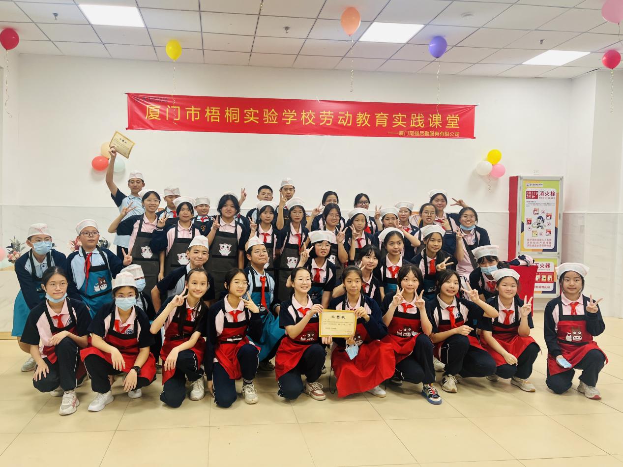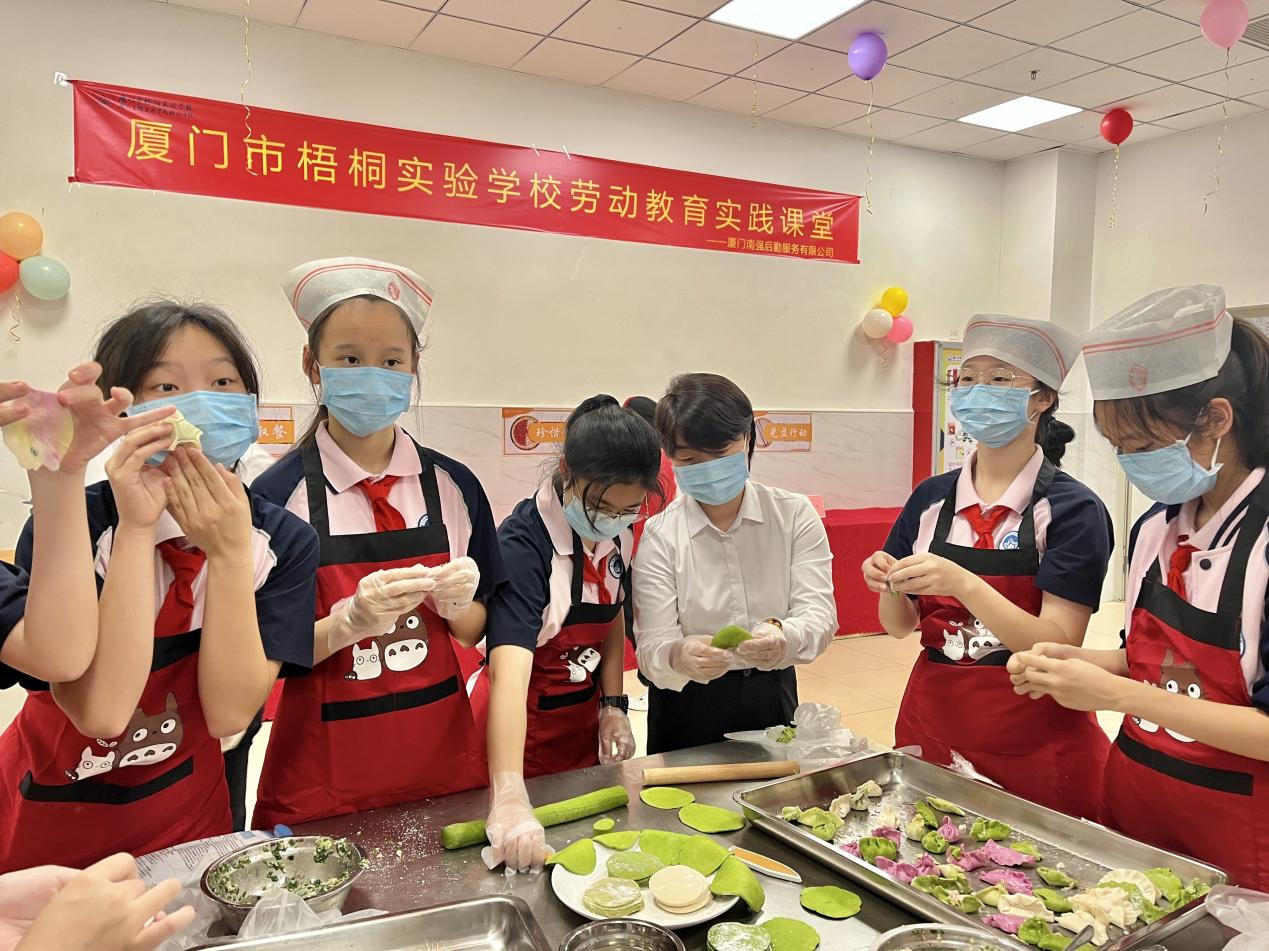 5月12日下午,厦门南强后勤服务有限公司所经营的梧桐实验学校餐厅与学校携手开展“包水饺”为主题的劳动教育实践课堂。校长邱耀宗与公司副总经理麻燕凌以及百余名七年级师生共同参与了这场特别的劳动体验。