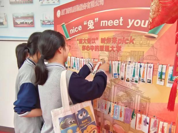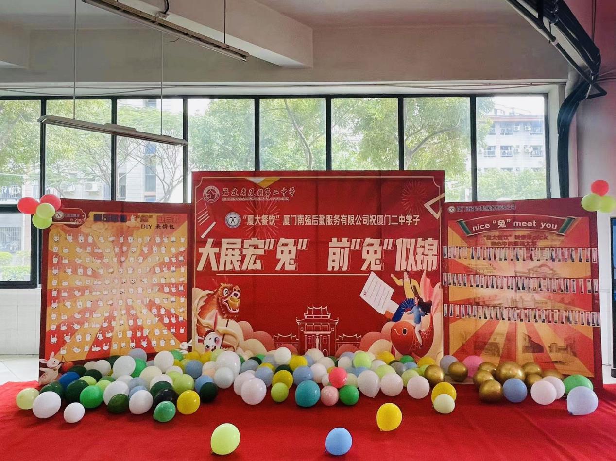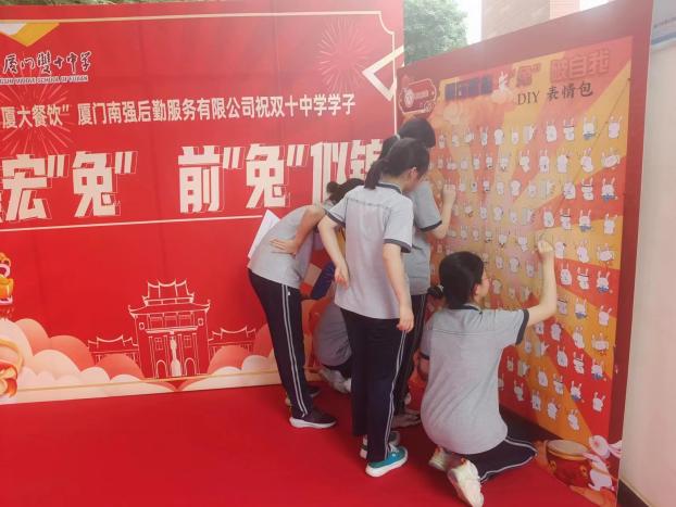 本次高考布置创设了“大展宏兔 前兔似锦”高考文化墙,以“兔年文化”为契机与宣传载体,弘扬中国传统生肖文化,意在祝福考生在学业上大展宏“兔”。右侧“兔”破自我DIY兔子表情包,为考生提供赋能减压互动板块,设置可绘制各式表情包的可爱兔子展板,让学生在下课用餐之余舒缓压力。左侧的Nice “兔”meet you——“厦大餐饮”喊你来Pick你心中的理想大学展板,引导考生们了解各大名校文化。拍照,打卡,互动,考生们玩得不亦乐乎!