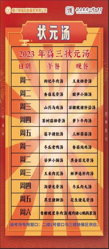 暖心助考,从关注营养开始。在确保食品安全的前提下,公司组织营养师精心选配每日营养食谱,为考生们提供营养均衡、美味可口的饭菜。免费状元汤、暖心糖水、高三专用窗口、状元套餐……餐厅针对高三推出的各种措施和优惠,让考生们在高考期间不仅吃得放心,还吃得实惠。一言一行总关情,一汤一菜皆是爱,营养美味的爱心饭菜、周到科学的餐饮服务、安全卫生的就餐环境,为考生提供有力的后勤保障是“厦大餐饮”人的郑重承诺。