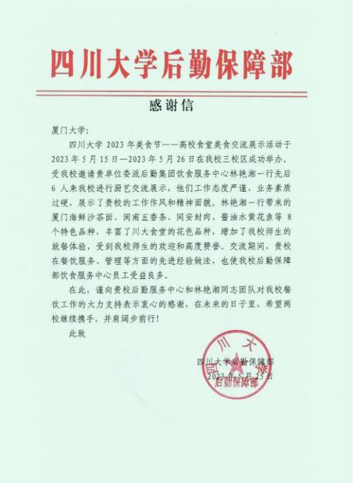 为期两周的四川大学高校菜品交流展示活动,中心交流团队带去海鲜沙茶面、厦门面线糊、同安封肉、厦门姜母鸭、厦门咸芋枣、避风塘焗明虾、酱油水小黄鱼、厦门五香条共8道经典闽菜,用最专业的水准和优质的服务赢得川大饮食同仁的赞赏和四川大学师生的热烈追捧。