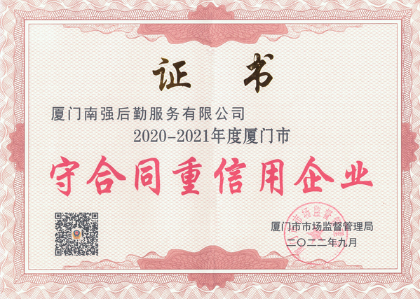 近日,厦门市市场监督管理局(知识产权局)正式向厦门南强后勤服务有限公司颁发2020-2021年度“厦门市守合同重信用企业”荣誉证书和牌匾。