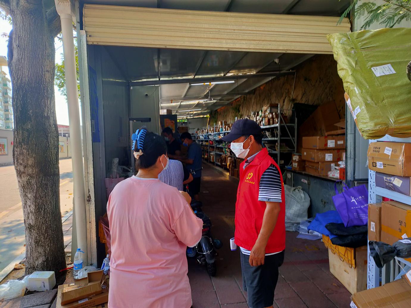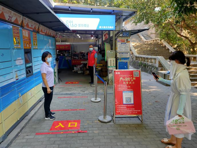 组织党员志愿者到鸟箱驿站引导学生扫场所码、测量体温有序排队取件