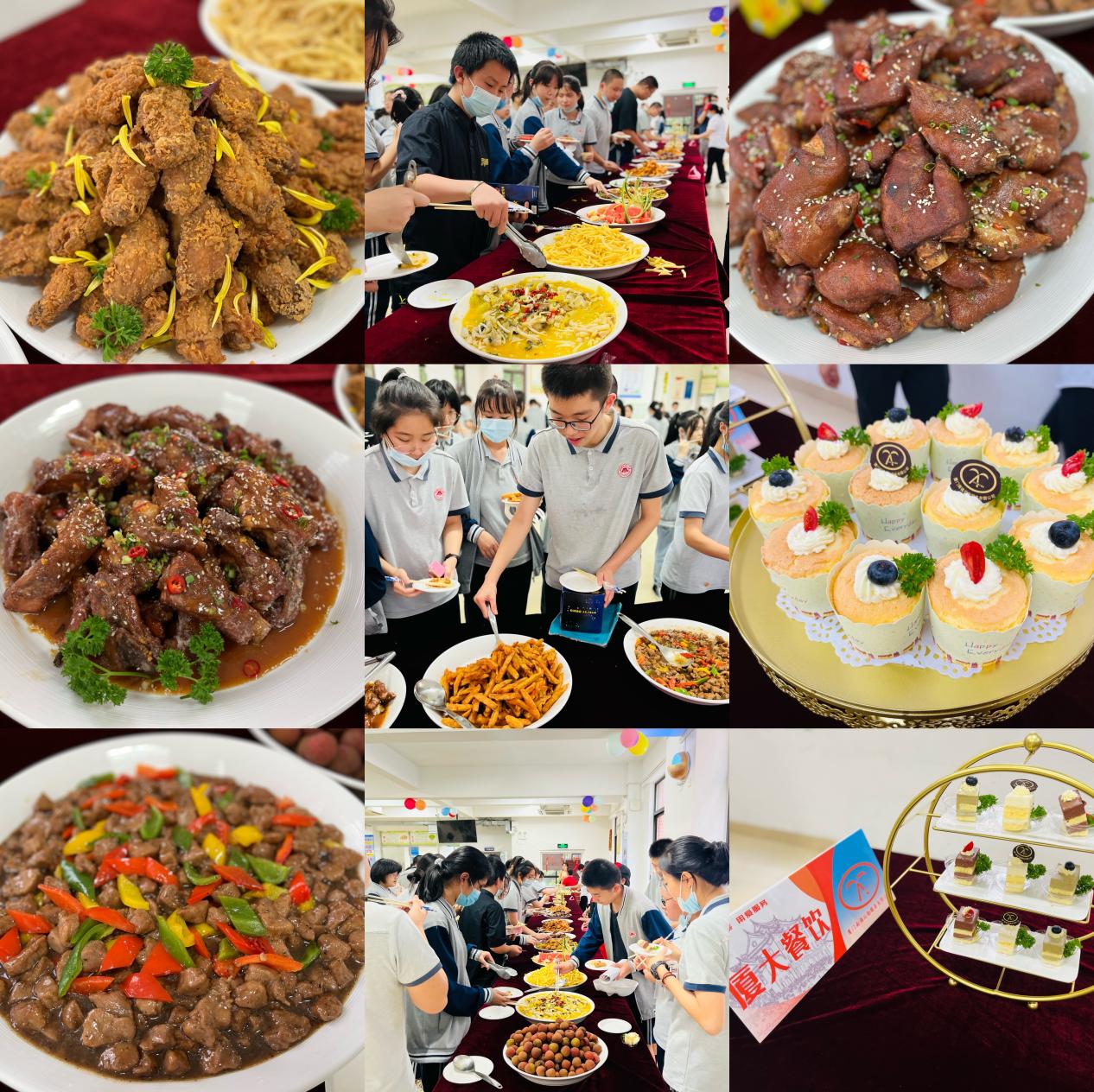 金榜题名、牛气冲天、展翅高飞、鱼跃龙门、永升排头、粒粒开心,一道道寓意满满,色香味俱全的美食逐一排开,同学们还未踏进餐厅,就被扑鼻而来的香味所吸引;种类繁多,口味丰富的各式甜品,让同学们既饱了眼福,又饱了口福;“包罗万象”的厦门博饼吸引了许多同学的目光,大家纷纷动手包制,品尝着自己的劳动成果,别有一番滋味。在美食中注入祝福与鼓励,“厦大餐饮”为初三学子冲刺中考加油助力!