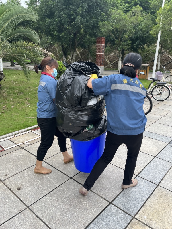 南强物业以28名员工完成主楼、图书馆保洁、消毒和6月10日-15日共计9场会务的保障任务,日清运垃圾20袋;敬贤物业部16名员工完成7栋教职工住宅保洁和消毒工作,每天清运垃圾11-14板车。