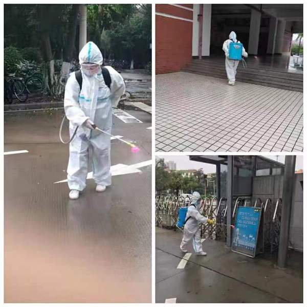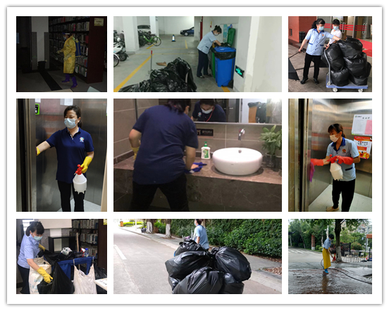 公环物业部道路组、学生园区组、公教组面对人员严重不足的困难,采取将人员打通使用的办法,合理进行岗位调整和任务安排,1人多岗,连续作战,加强重点区域消毒,全力保证垃圾清运,尽力提供基础保洁:17名保洁员负责23个园区61栋学生宿舍的保洁工作,每名保洁员要负责将近4栋楼、8单元,日均清理垃圾90余筐,160余中袋垃圾,同时从本部调用1部垃圾清运车和驾驶员,从凌晨5:30分开始,一天三趟往返,6月7日-9日共清运学生园区、教学楼、校内商户、食堂、敬贤教职工住宅等区域的垃圾40吨;公共教室管理员身兼多职 ,在完成学院防疫点布置、出入口扫码测温岗布置、楼栋防疫温馨提示张贴、院楼防疫消毒、卫生保洁等保障工作及领导临时分配的任务外,还要身兼安防员工作,负责楼栋安全巡查,仔细核对出入楼栋人员的扫码登记和体温监测,创意与创新学院的公教管理员最长一天在岗12个小时。