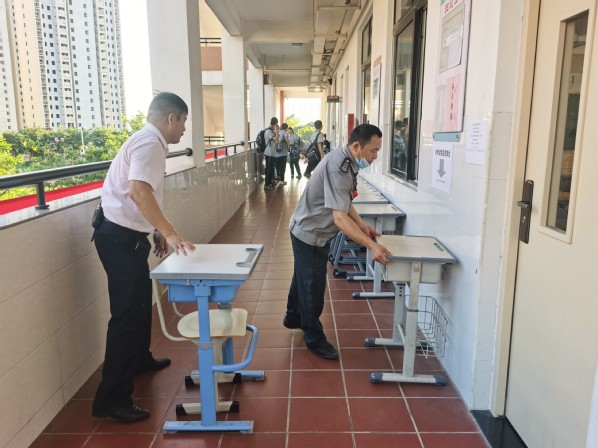 临近考试的前两天,考点学校项目物业人员全体出动,开始布置标准化考场,排好桌椅、挂好钟表、遮挡考场内所有文字、保洁、消毒、准备无标签矿泉水、摆放桌垫和镇木、搬运物品暂存铁皮柜、张贴考试相关通知,每一项工作都完成的认真细致,确保考试顺利。