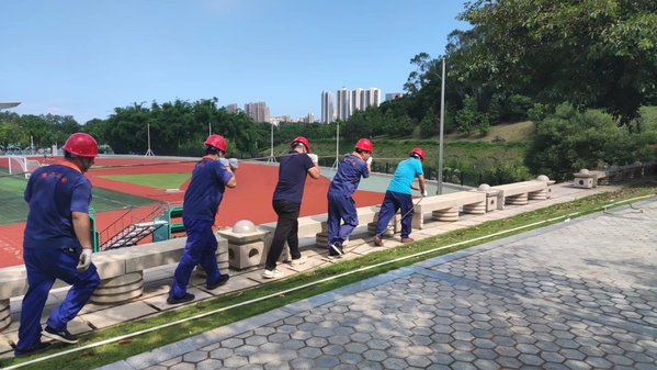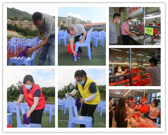 6月30日毕业典礼当天,物业部召开毕业典礼前会场保障布置会,细致布置相关工作:擦拭会场约3600位椅子、对主席台路面台阶进行清洗和消毒、做好毕业典礼会场周边公共卫生间保障并配备充足的海洋桶、加强北区田径场设置“毕业门”处主要路面卫生保障……每项工作均落实到人。上午7:30,服务办党支部的党员们就来到北区操场,和公环物业部的道路保洁、绿化员工、青年文明号成员们一起,顶着烈日,擦拭毕业典礼会场的桌椅,清理周边的白色垃圾,每个人都干得汗流浃背,但没有人停下手里的活,没有人敷衍了事。