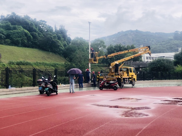 今年的毕业典礼暨学位授予仪式依然在北区田径场举办。漳州校区水电维修部自接到现场灯光、电源提升等任务后,就积极开展设计钻研,总结去年毕业典礼会场照明提升的经验,提出毕业典礼会场灯光、电源布置提升方案建议:一是继续提升照明亮度,在主席台前增加一排射灯,将毕业门两侧临时照明由4盏1000W射灯提升为2000W投光灯;二是提高活动电源的配置,为保障会场电源稳定运行万无一失,本次毕业典礼依旧采用一主一备双电源供电模式,同时电源全部采用新电缆。