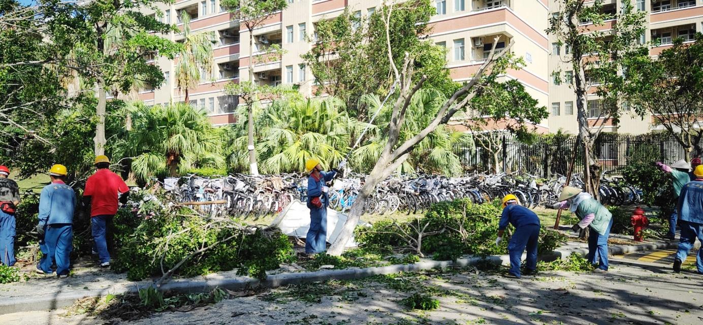 2020年,台风“米克拉”在漳州漳浦登陆,漳州校区身处台风中心风圈受损严重。思明和翔安校区火速支援漳州校区,三个校区员工并肩作战,累计投入2262人次清理外运树枝树叶1430车。