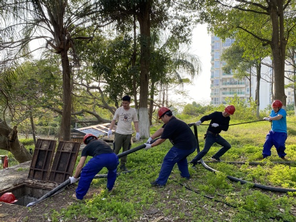 3月24日,中心员工完成核酸检测用电保障后,稍事休整后即刻冒雨抢修迁移芙蓉隧道西端北侧消防水管。