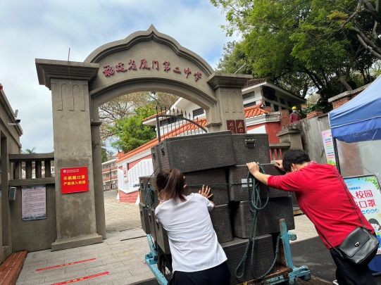 饭菜从打包好到师生享用的这一过程并不轻松。一份份饭菜装在保温箱里,两所学校所有师生的一餐饭大约需要70余个保温箱,这些保温箱先从厦门岛内通过轮船运送到鼓浪屿的码头上。鼓浪屿上禁止机动车,对于旅客来说这里是世外桃源,充满面朝大海、春暖花开的浪漫,但对于货物运输就不是那么“友好”了。