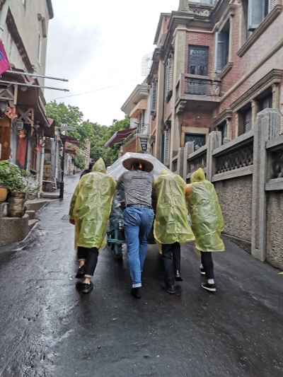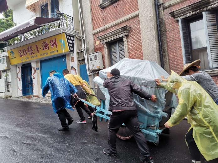 饭菜从码头到学校还有很长一段距离,那段距离全靠人力板车运输。鼓浪屿海拔并不高,但岛上有很多陡坡,从码头到学校的途中就有很长的一段,单靠车夫一人拉不上去,此时就需要党员与志愿者们在板车后面帮忙推车。