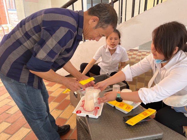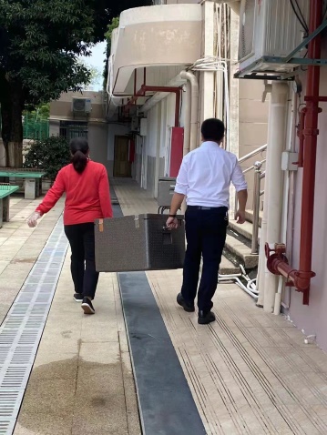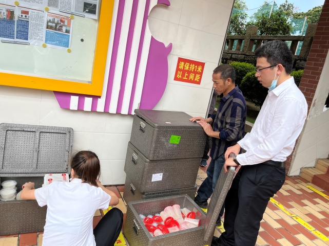 在车轮的滚动声中,保温箱到达了学校教学楼楼下,公司志愿者们开始卸车、分餐。厦门二中鼓浪屿校区是初中部,每个年级6个班,每个班级大约三四十人,总共18个班级。米饭、菜、汤、餐具都需要以班级为单位分好,放在保温箱内,做好保温工作。饭菜温度较高,大家在分餐的时候经常会被烫到,但丝毫没有慢下分餐的动作。分好餐后,大家才能将保温箱搬运三、四楼的班级门口,待他们一下课便能立即吃上热腾腾的饭菜。
