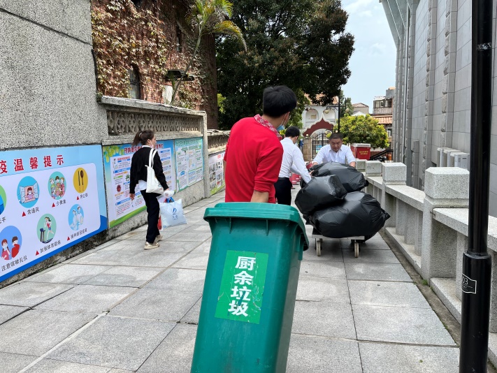 师生们结束用餐后,志愿者们需要去回收保温箱与餐盒。大家将一袋袋厨余垃圾装好,然后搬运至校门口的回收处,在搬运途中还要小心垃圾袋破损而导致垃圾满地,当垃圾散落时大家主动将其清理干净,保持好干净整洁的校园卫生环境。28日那天下了一整天的大雨,撑伞不便于搬运,公司志愿者们就在雨中送餐与搬运厨余垃圾。