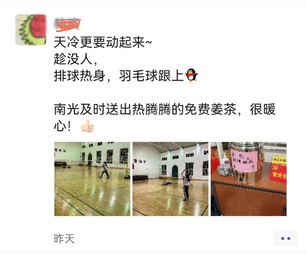 姜茶性温,有温中散寒、温肺止咳的功效,最适合在寒冷的天气里饮用。清晨时分,食堂的叔叔阿姨们就开始忙活了,把备好的生姜、红枣、枸杞等食材洗净切好,文火慢熬,再装进保温桶。放在食堂大厅醒目位置,并细心地张贴标识,提醒前来用餐的师生们免费领取。来往老师同学们纷纷驻足,有序排队,装上一杯热气腾腾的姜茶捧在手心。姜茶入口,暖人肺腑,大家道出真诚的感谢与称赞,使得寒冷的冬天因为这一杯杯姜茶变得温暖起来。