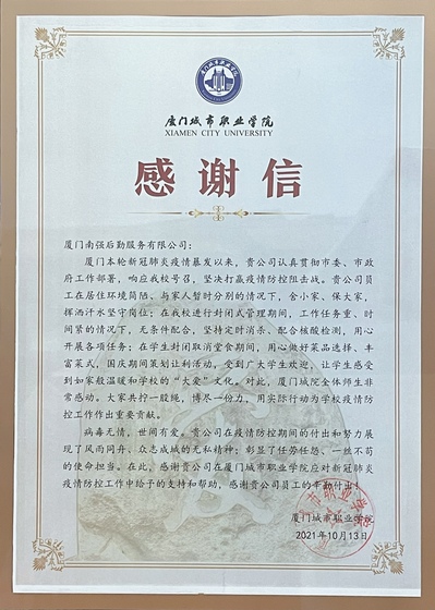 12月9日上午,厦门南强后勤服务有限公司收到厦门城市职业学院送来的锦旗和感谢信,感谢我方在疫情期间,守望相助、携手并进,有序、有情地保障了全院师生的餐饮后勤工作顺利开展!