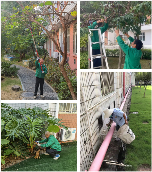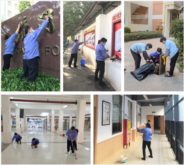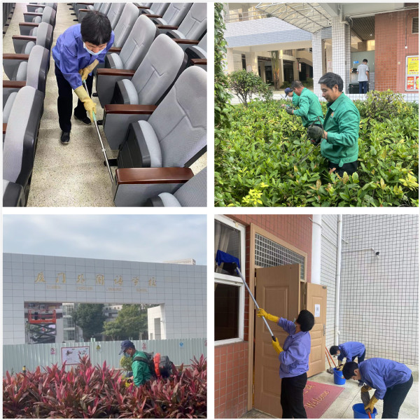 保洁员对校园教学楼、雕像、外围墙面、道路等进行大清理、大擦洗、大扫除,确保无死角、无顽渍;绿化养护员把校园打理的生机盎然,草地碧绿、树形优美、花儿绽放,使校园面貌焕然一新,他们认真忙碌的身影,成了校园一道靓丽的风景线。
