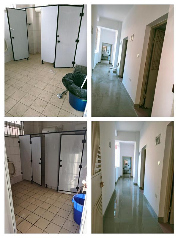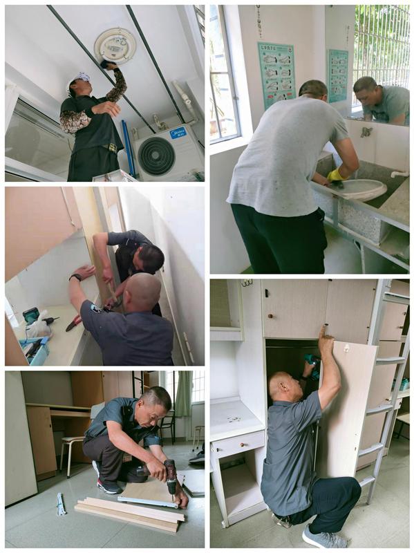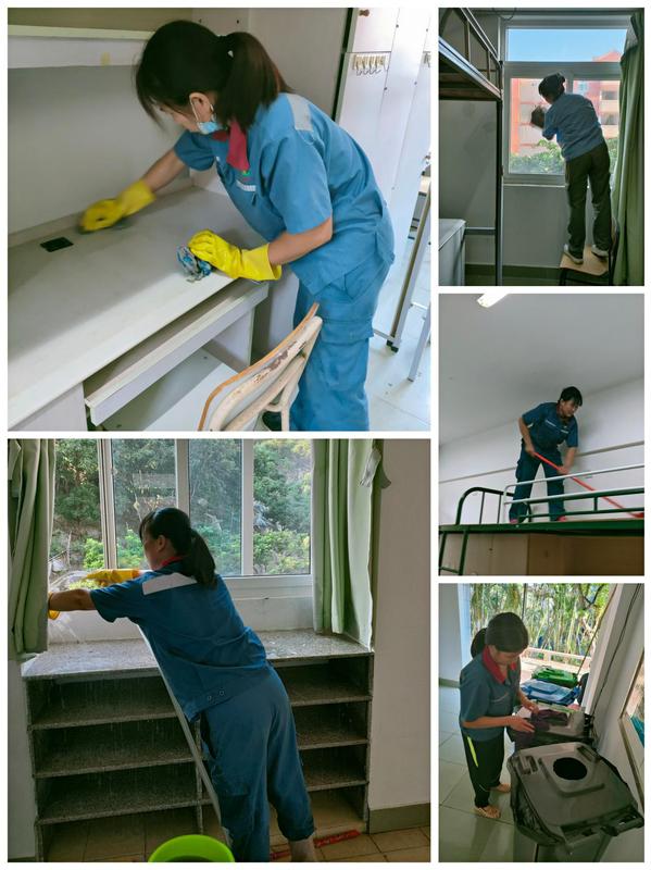 宿舍保洁员加班加点,用5天时间,在完成各自园区日常卫生保洁的同时,全力支援若谷园区马来西亚分校新生宿舍的保洁任务。安防员分成两组对宿舍进行检查:一组队员逐一清洗房间空调及阳台灯罩,另一组则做好家具检修,对损坏的书桌抽屉或者外侧脱皮的衣柜进行维修更换。