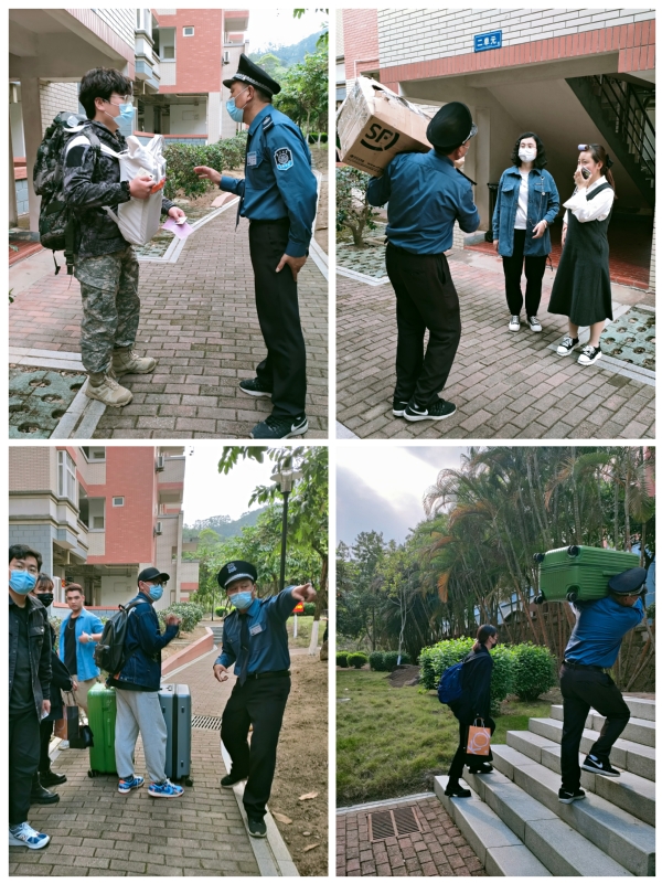 巡逻队员王亚忠在若谷园2至3分叉口为同学们指路,热心帮他们搬运行李。