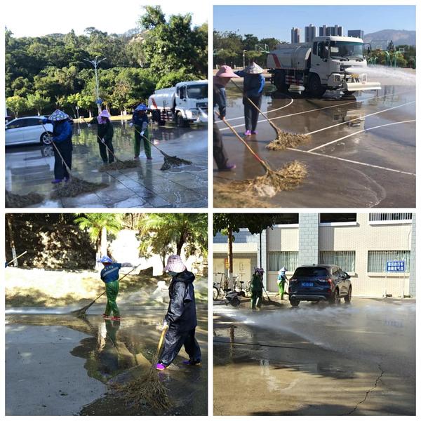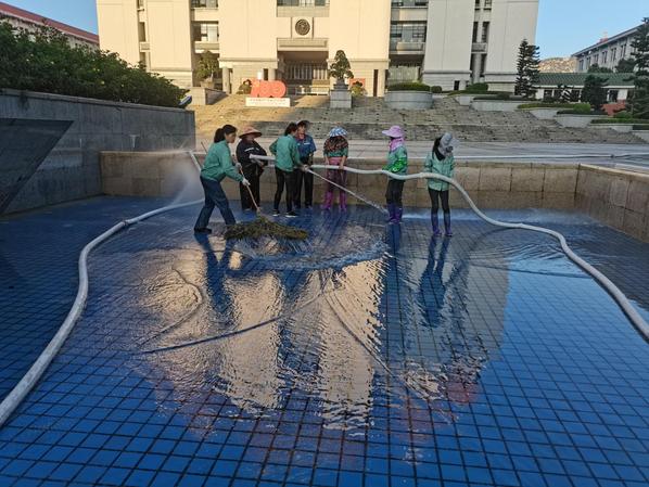 道路保洁组提前清洗校区各路段路面、北区若谷周边、月亮桥、南区隧道、主楼群等区域卫生,擦拭嘉庚铜像,清洗四个校门,清洗嘉庚广场的涌泉池,绿化组员工修剪校区绿篱及主楼群前盆栽,打造干净整洁的校园环境。