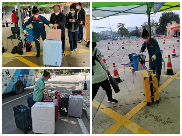 11月13日,物业部转入“迎新模式”。道路员工分3组在中门帮马来西亚分校学生消杀行李物品。