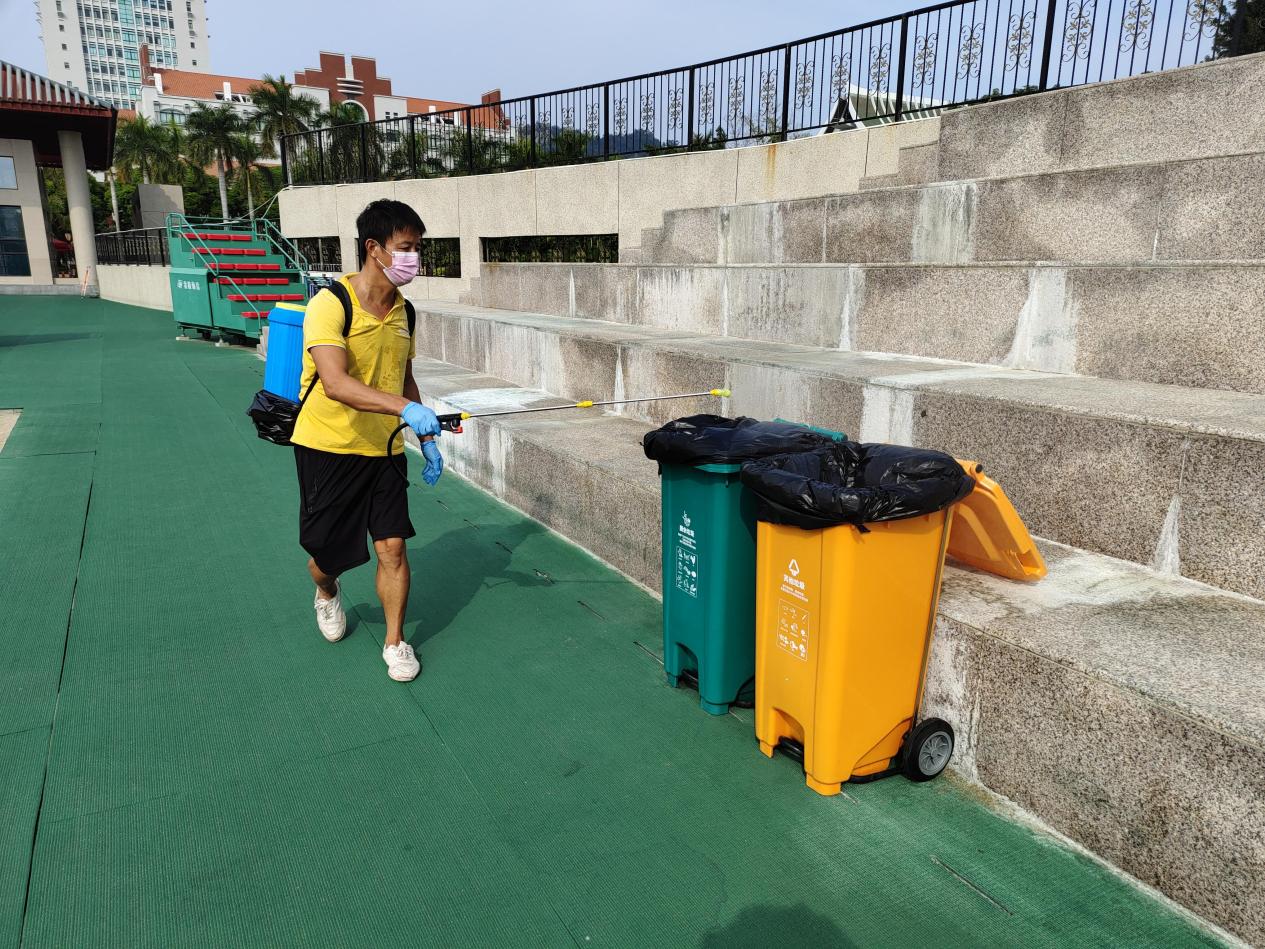 运动场馆:全面清扫演武场、上弦场、东苑球场、明培馆,清理周边的卫生死角,如角落杂草、白色垃圾、落叶等。对室外运动场进行消杀,特别是出入口、运动器材、主席台等,消杀面积约3万平方米。