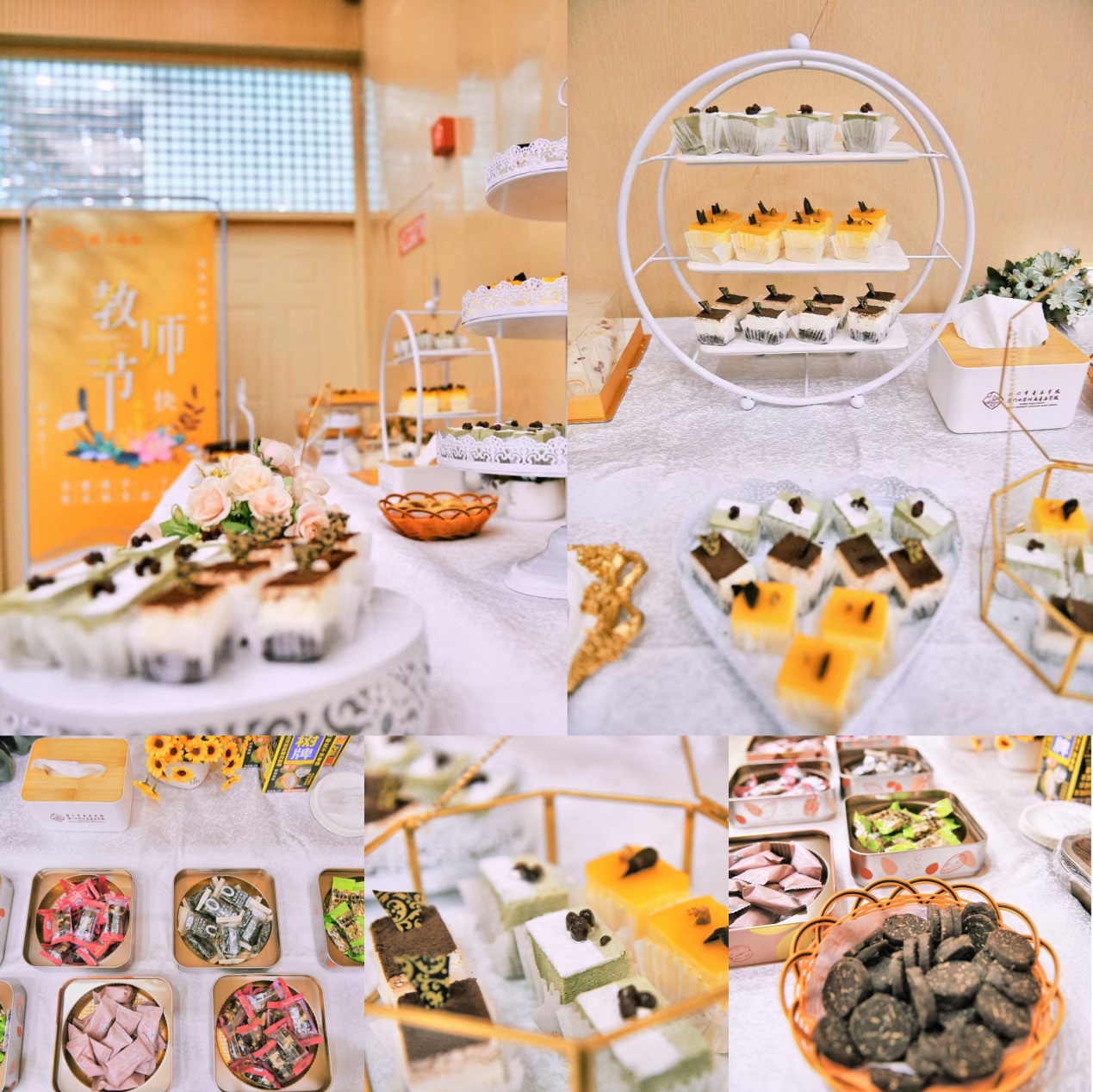 公司文宣小组、菜品研发小组与各餐厅提前筹备,文宣小组为教师节互动氛围布置统一设计并订制打卡画框与祝福展架;菜品研发小组携手各学校餐厅精心策划营养菜单,为老师们提供新鲜美味的自助餐、节日蛋糕、酸奶水果等,大家欢声笑语,共聚一堂。