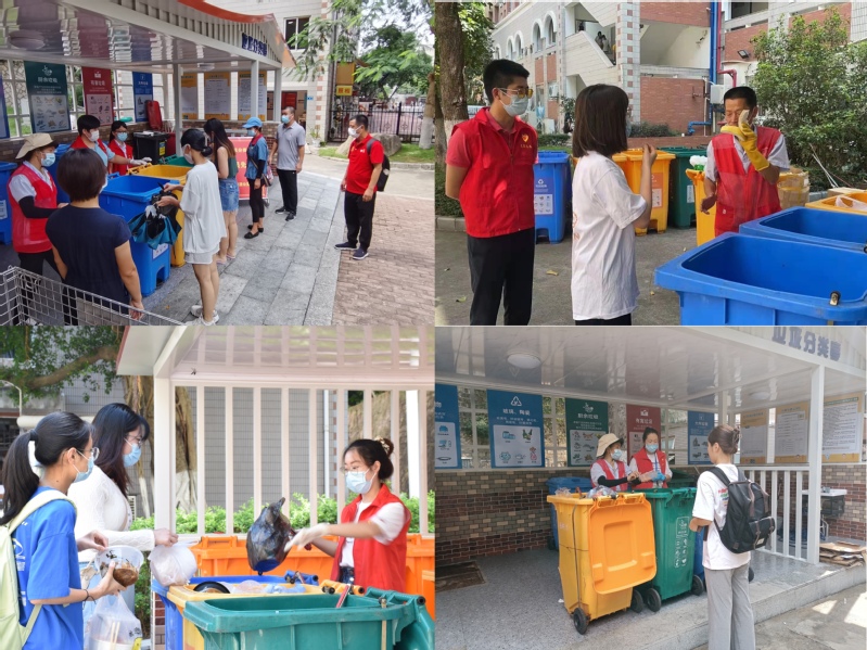 公寓党支部党员、中心办公室成员发挥示范表率作用,下沉垃圾分类点,担当起督导责任,协同垃圾分类督导员耐心指导学生进行垃圾分类,同时对垃圾分类亭周边进行巡查,发现垃圾及时清理,保持周边环境干净整洁;对部分较大的垃圾分类点位如芙蓉6和芙蓉8实行连续12小时督导,确保垃圾分类成效。集团党支部党员志愿者也前来支援,协助垃圾分类督导。