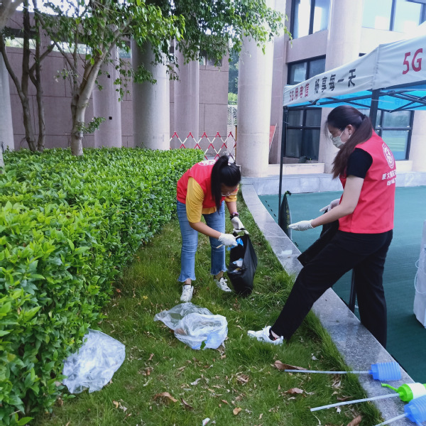 上午8点,参加活动的志愿者们身着红色志愿者马甲,拎着垃圾袋等工具,仔细认真地捡拾地面垃圾。不论是深入灌木丛的饮料瓶,还是散落在污水井盖下的小烟头,志愿者们都一一弯腰捡起,细心地从缝隙中抠出,不放过任何一片区域、任意一处死角。