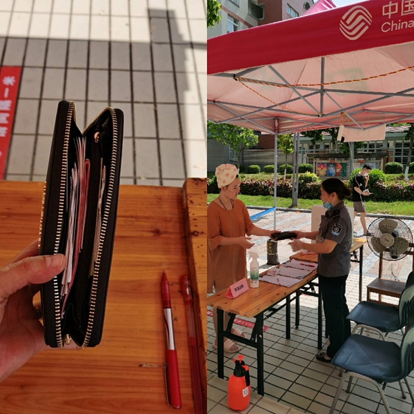 囊萤园区毕业生不慎将钱包遗落在测温点,内有1600元现金和身份证、银行卡、港澳通行证等重要证件,园区安防员发现后及时联系同学到场认领。