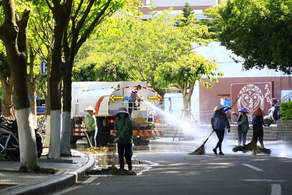道路员工提前清洗校区四个大门、主干道,对大环境进行消毒