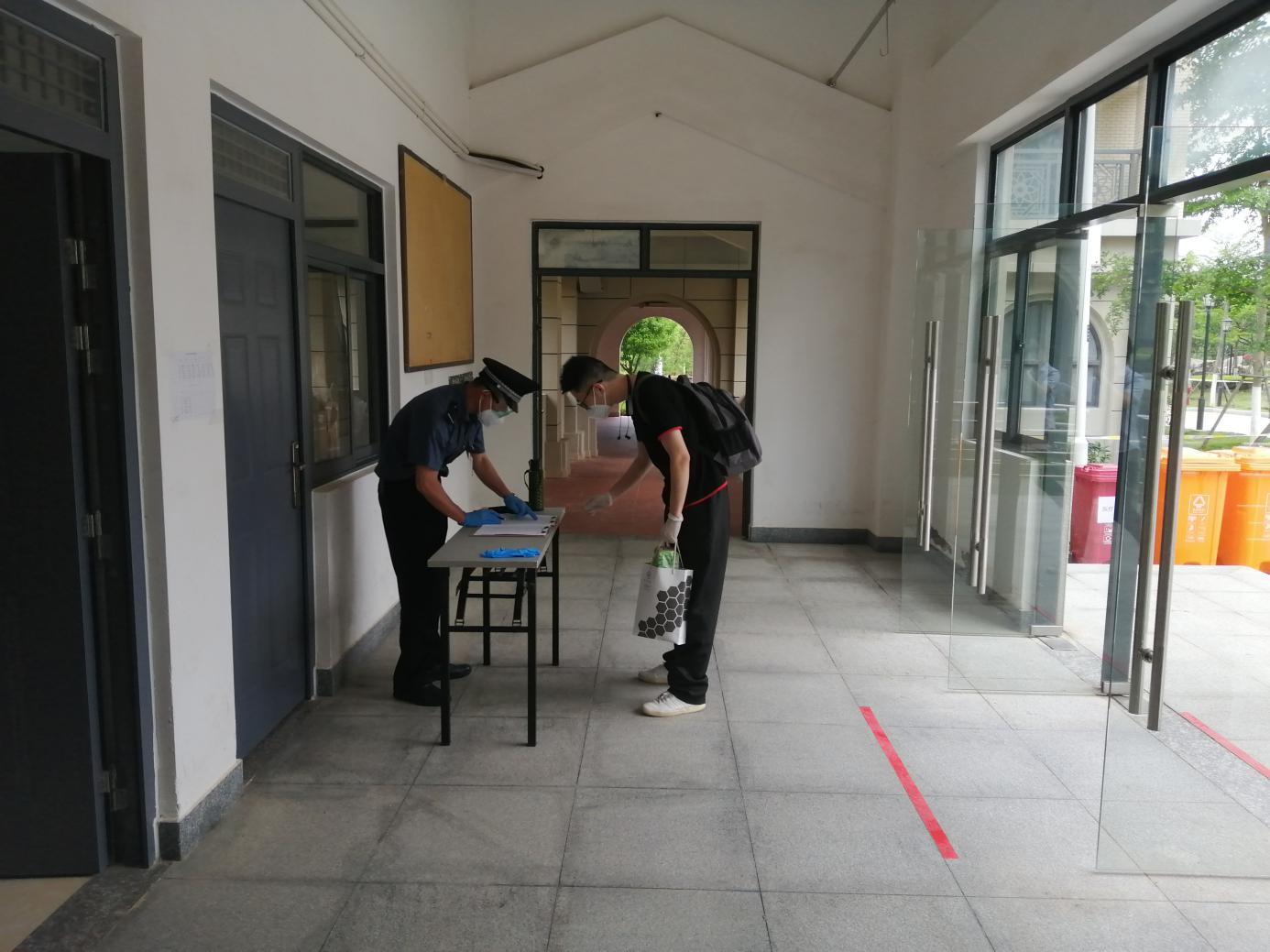 学生入园区前需进行体温检测,安防员登记入住信息