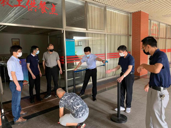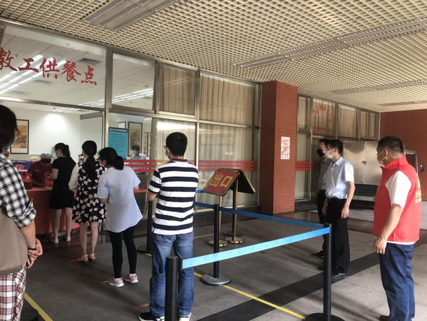 实地考察主楼教工餐厅供餐通道,布置出入口标识、一米线、温馨提示