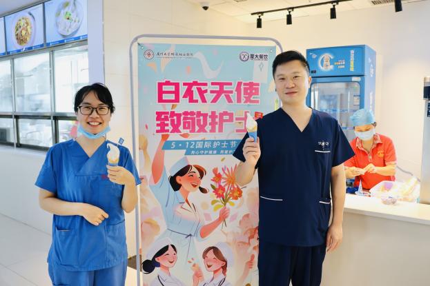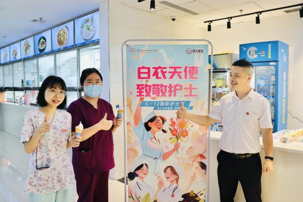 5月10日,厦门大学附属翔安医院餐厅为前来就餐的医护工作者提供自制脆皮甜筒,送上一抹清凉与甜蜜,这抹甜萦绕在医护人员心间,让医护人员喜笑颜开,舒缓工作压力,获得了院方的高度好评!