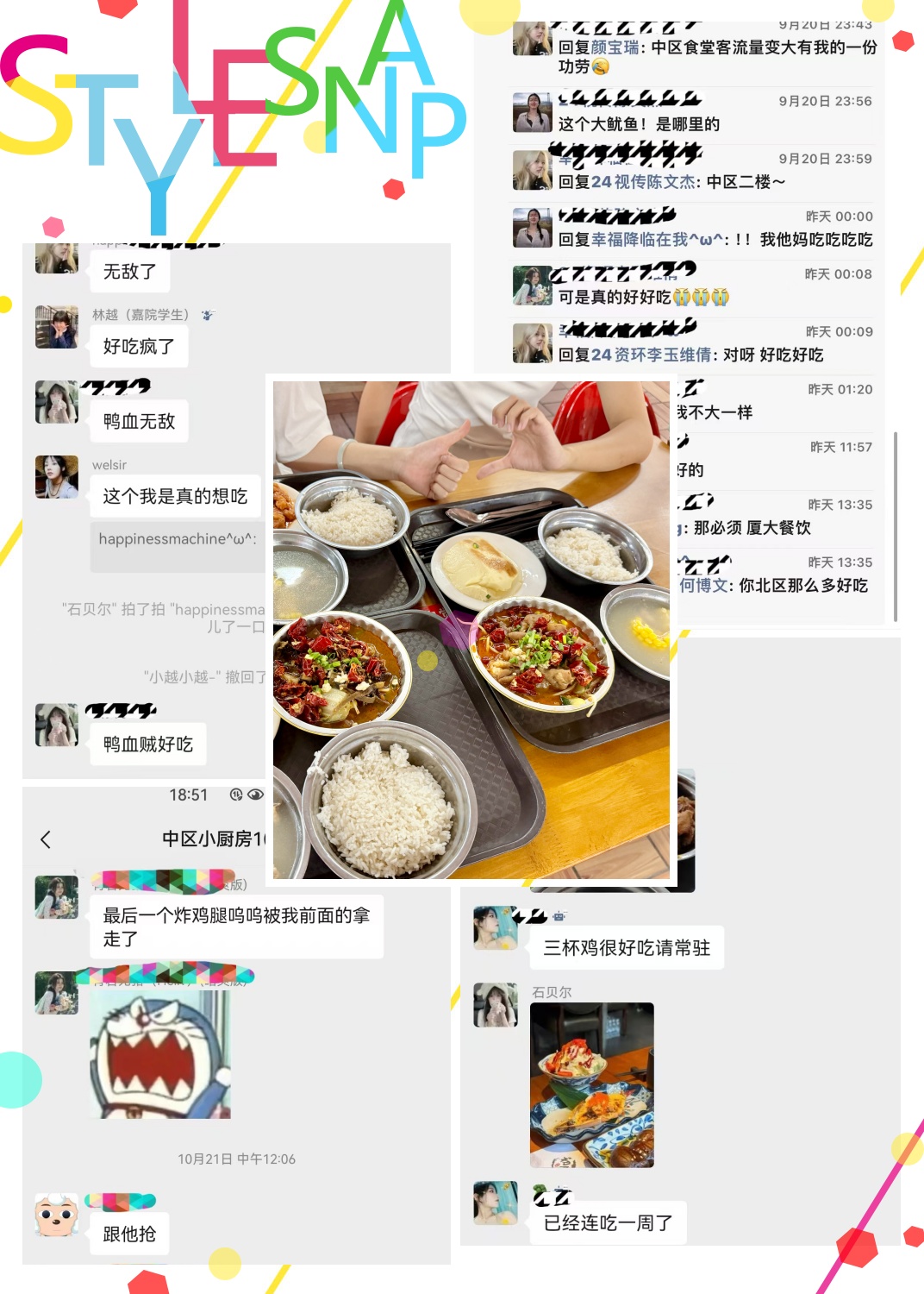 除了舌尖上的体验,美食周活动前,餐厅建了三个美食群,以此作为宣传阵地,和广大师生积极互动,结合美食周进行了免费试吃、“柿柿如意”、美食抽奖等精彩纷呈的活动,甚至师生在群内说想吃什么,餐厅结合实际情况,能制作的立即安排采购、研究制作、烹饪、试菜,尽快推出,“解锁”大家想吃的各类家乡美味,极大调动了师生的参与积极性,提高了用餐满意度,达到了较好的互动效果。