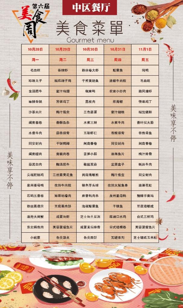 集团领导关心美食周筹备工作,中区餐厅按照相关指示,将此次活动作为展示餐厅形象的良好契机。为做好本次“美食周”工作,中区餐厅管理层多次向校区餐饮部汇报,落实相关意见、要求,集合骨干数次召开专题会议,提早进行精心的策划和筹备,包括对美食周活动的形式流程、用餐区的氛围布置、菜肴的选材搭配等。组织全体员工提建议完善菜品的制作方法、丰富菜肴口感、多渠道采购食材,激励厨师团队研制菜色、挖掘潜力和特长研发创意菜品。餐厅厨师纷纷拿出看家本领,用精湛的厨艺制作了100余种美食供在校师生品尝,给用餐者带来各色香味触的新鲜体验,让师生在学习之余舒缓身心、元气满满,获得满满的幸福感!