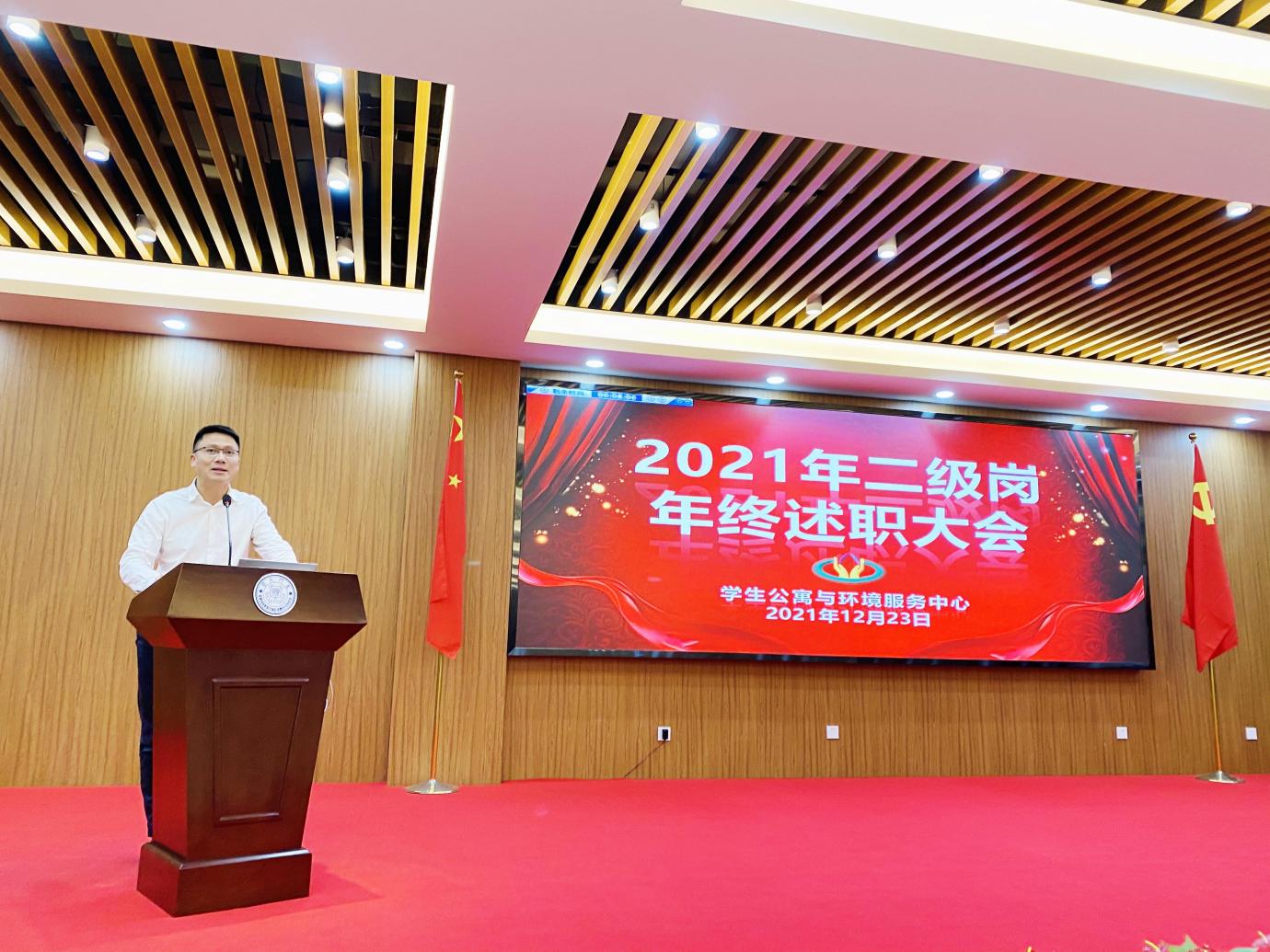 为梳理总结2021年工作,及早谋划2022年工作,同时进一步加强管理骨干的沟通交流,12月23日上午,学生公寓与环境服务中心二级岗人员年终述职大会在东苑餐厅二楼召开,集团分管领导李启忠副总经理到会并作动员讲话,中心主任谢伟锋,副主任薛荣城、叶晓真、郑剑培,二级岗人员等参加述职会。叶晓真主持述职会。