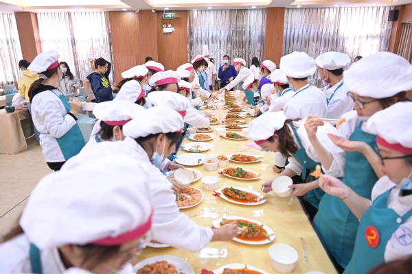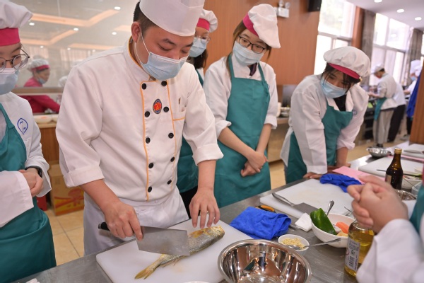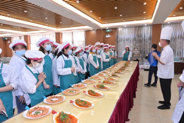 在闽菜大师、闽菜名师们的有序指导下,同学们或生涩或兴奋地实践起来,现场一片热火朝天。从处理活虾开始,挑战就扑面而来,可见平常会烹饪的同学还是少数,劳动教育课还是很有必要的。有些同学表示“这是第一次下厨做菜”,有的同学则说“学到了炸鱼油温要七成,从鱼尾巴开始下锅,而且鱼尾巴要先定型”,还有的说“在家会做一些家常菜,但椒盐虾和厦门红烧鱼还真没做过,现在学会了,寒假过年回家露一手”……种种体会不一而足,但同学们都难掩骄傲自豪的表情,纷纷拍照定格这一珍贵的画面。