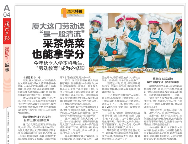 据了解,2020年11月,厦门大学在全国高校当中率先推出了《新时代中国特色社会主义劳动教育》选修课程,也是由中国注册烹调大师、饮食服务中心主任江森民带领三位闽菜大师进行烹饪指导教学,共113名同学参加。人民日报微博还刊发了相关报道。