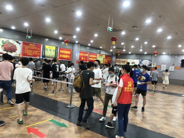 党支部包干餐厅,党员志愿者全力支援。为了缓解餐厅人员不足,后勤集团党委统筹协调,堂食第一天,仅思明校区本部,运输党支部、本部党员支部、综合党支部、物业党支部、南强后勤党员支部就派出62人次党员志愿者,分别包干支援勤业餐厅、芙蓉餐厅、南光餐厅、海滨餐厅、公寓一期餐厅、公寓二期餐厅,帮助餐厅引导师生有序取餐。