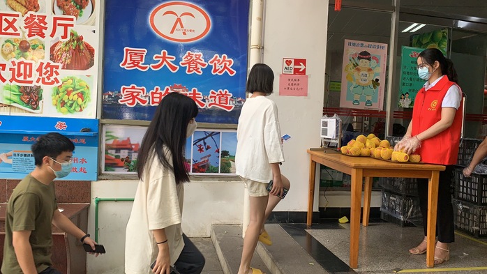 10月6日11:00,恢复堂食的第一天午餐,思明校区勤业餐厅门口小广场,开展主题“守得云开见月明 担当奉献彰本色”的恢复堂食“送苹果·报平安”活动,为每个用餐师生员工送上一个苹果,祝愿平安健康。这是后勤集团各餐厅继中秋节送每个同学一个月饼之后再一次为师生员工送“平安”。