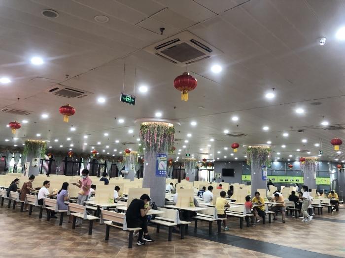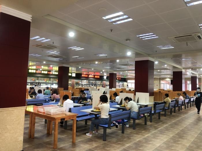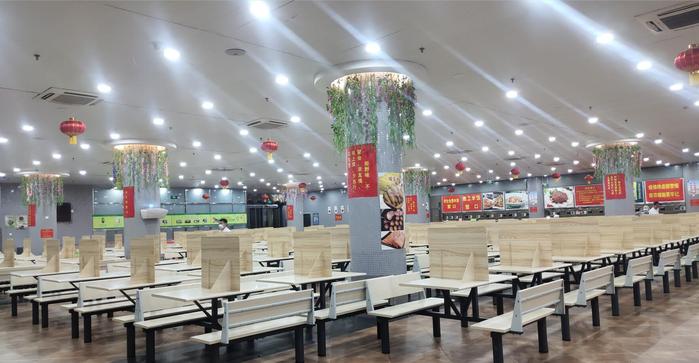 接到恢复堂食的通知后,5日晚,饮食服务中心各餐厅连夜搬抬桌椅、摆放隔板复位,餐具清洗消毒检测到位。