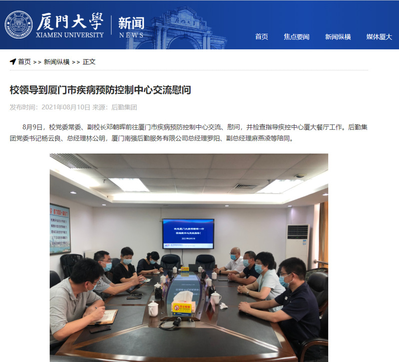 厦门大学官网8月9日新闻纵横栏目,刊登《校领导到厦门市疾病预防控制中心交流慰问》新闻稿,介绍校党委常委、副校长邓朝晖到厦门市疾病预防控制中心交流、慰问情况。